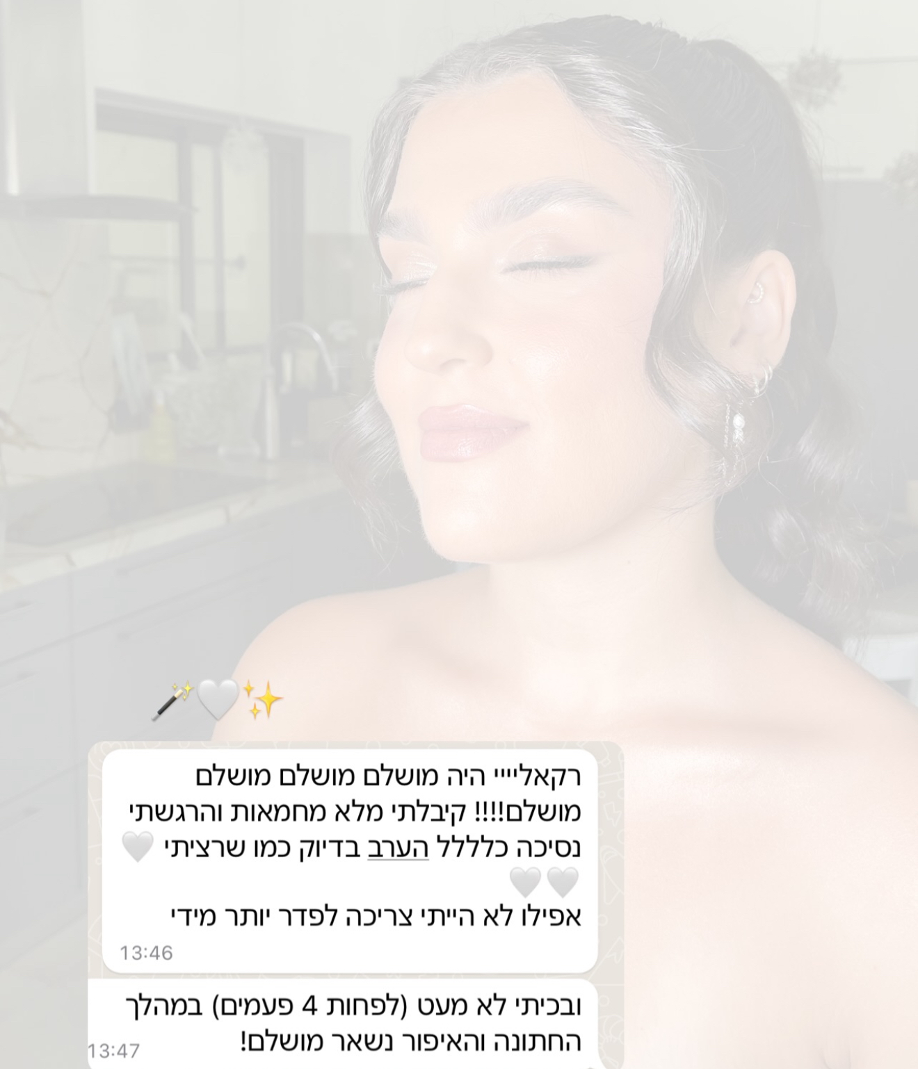 מהרגע שאת סוגרת איתי את תאריך החתונה, אני שלך לכל שאלה החל מהזרקות ועד שאלות על טיפולי פנים ושיזוף. אשמח לתת לך איפור ניסיון כדי שתדעי בדיוק מה הסגנון איפור שיהיה בחתונה, וביום החתונה אני שלך בשעה שקבענו, ואז כמה דקות לפני החופה אני מלווה אותך לתת לך רענון לאיפור ושינוי לוק אם תרצי אחרי סבב ריקודים ראשון.